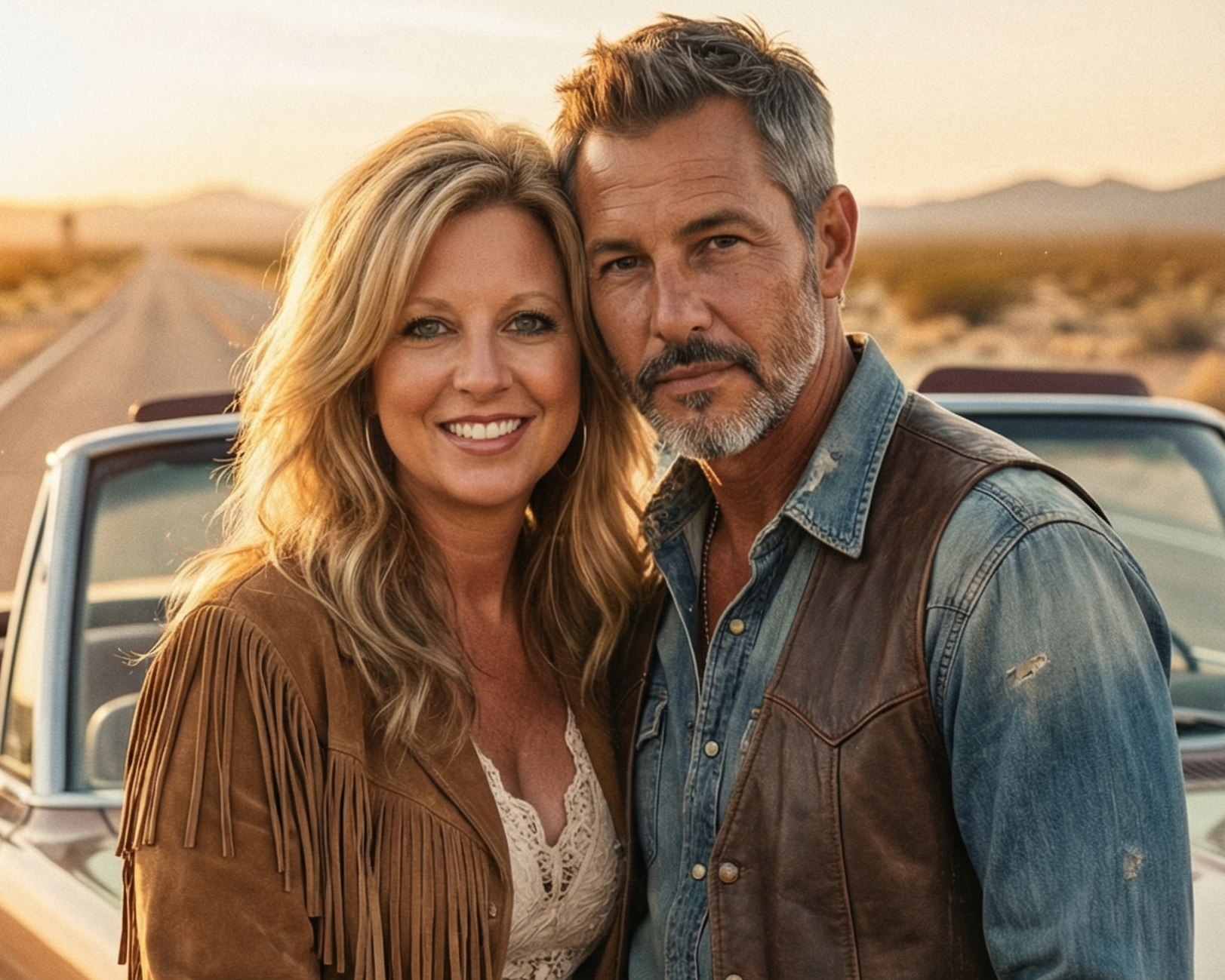 Heather Killebrew in a fringe jacket leaning against a classic car on a desert road. Close up portrait of Heather Killebrew during a desert sunset road trip.