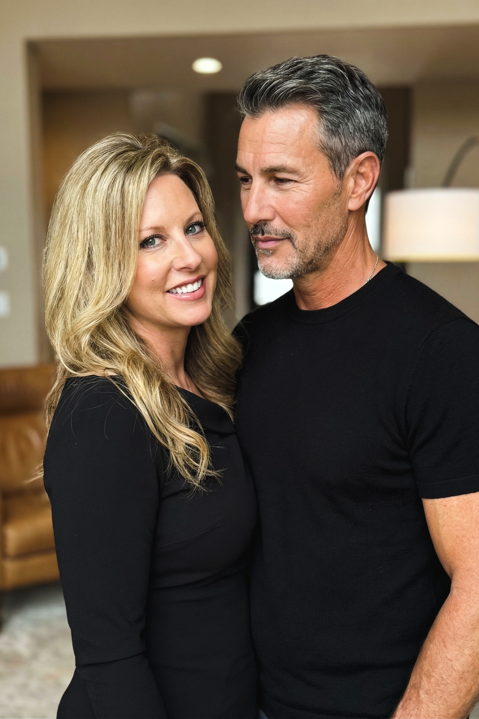 I really love this picture of us from a nice evening at home. I decided to wear a simple black dress, and I think the lighting in our living room makes everything look so warm and cozy. It was such a quiet and happy moment, and I am so glad we captured it on camera. Looking back at photos like this always reminds me of how peaceful it feels to just relax and be together. It is definitely one of my favorite memories from this year, and I love how natural and comfortable we both look in our own space.