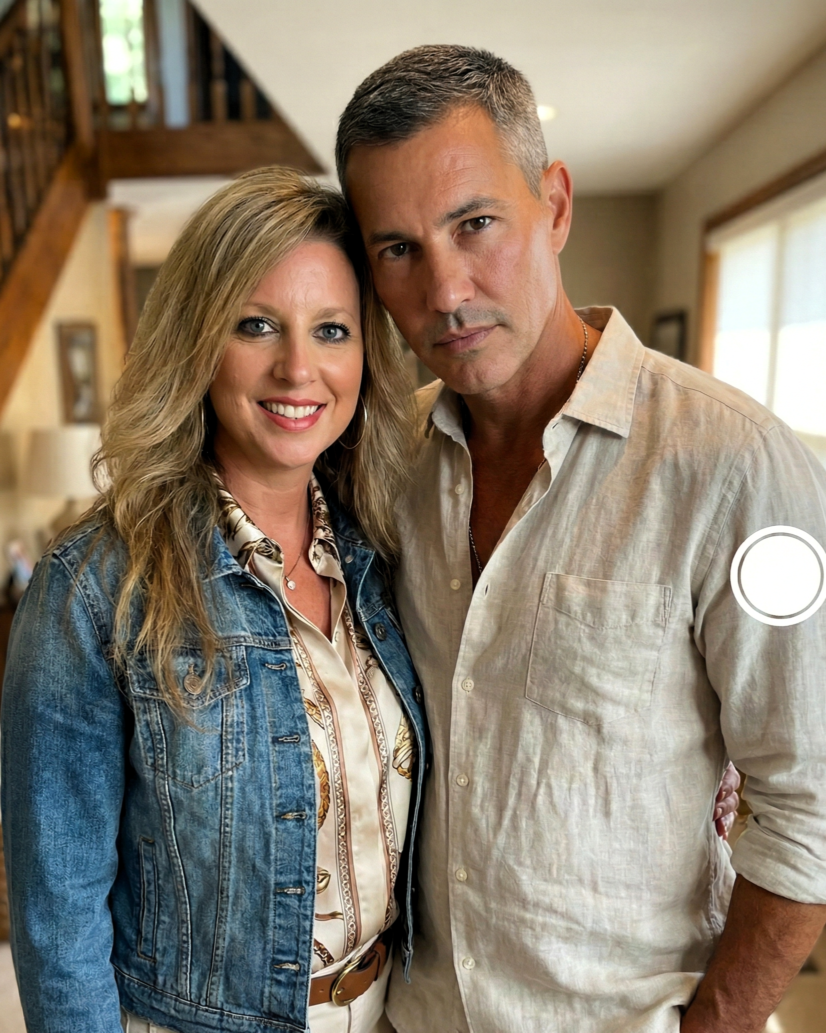 I really like this picture of us at home today. I decided to wear my favorite denim jacket over a pretty silk shirt that has a gold pattern on it. It felt like a nice, classic look for just hanging out together. We were standing near the stairs where the light was coming in just right from the window. It is so nice to have photos like this that show us just being ourselves in our own space. I love how comfortable and happy we both look in this moment. It was a really quiet and good afternoon, and I am glad we caught it on camera.