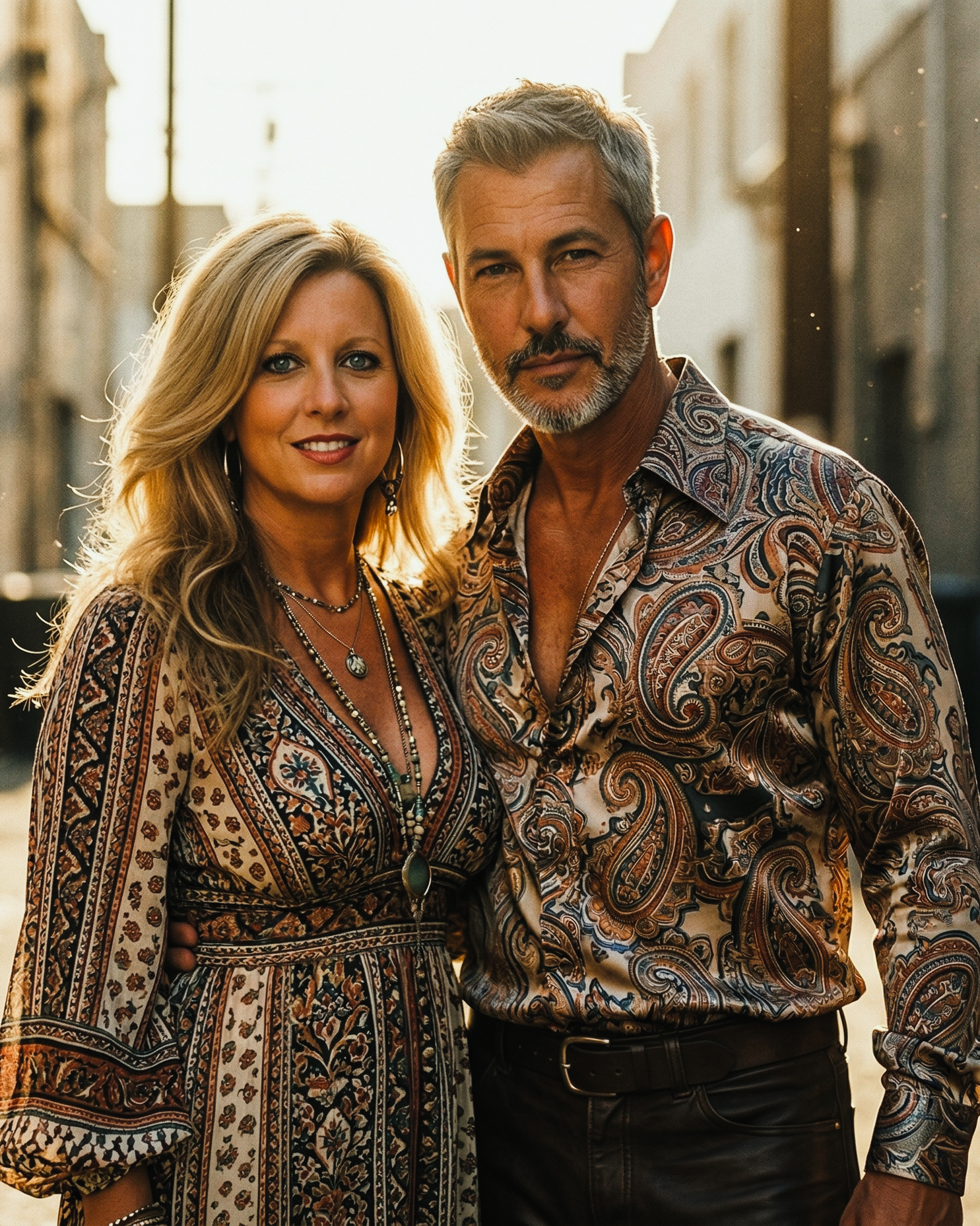 I really love this picture of us from our afternoon in California! The sun was just starting to set, making everything look so warm and golden behind the palm trees. I decided to wear my favorite embroidered blouse with this brown leather vest because it felt like the perfect style for our road trip. We were just hanging out by this cool classic car and enjoying the beautiful weather before heading to our next stop. It is one of those simple moments that feels so special because the lighting was just right and we were having such a great time exploring the city together.