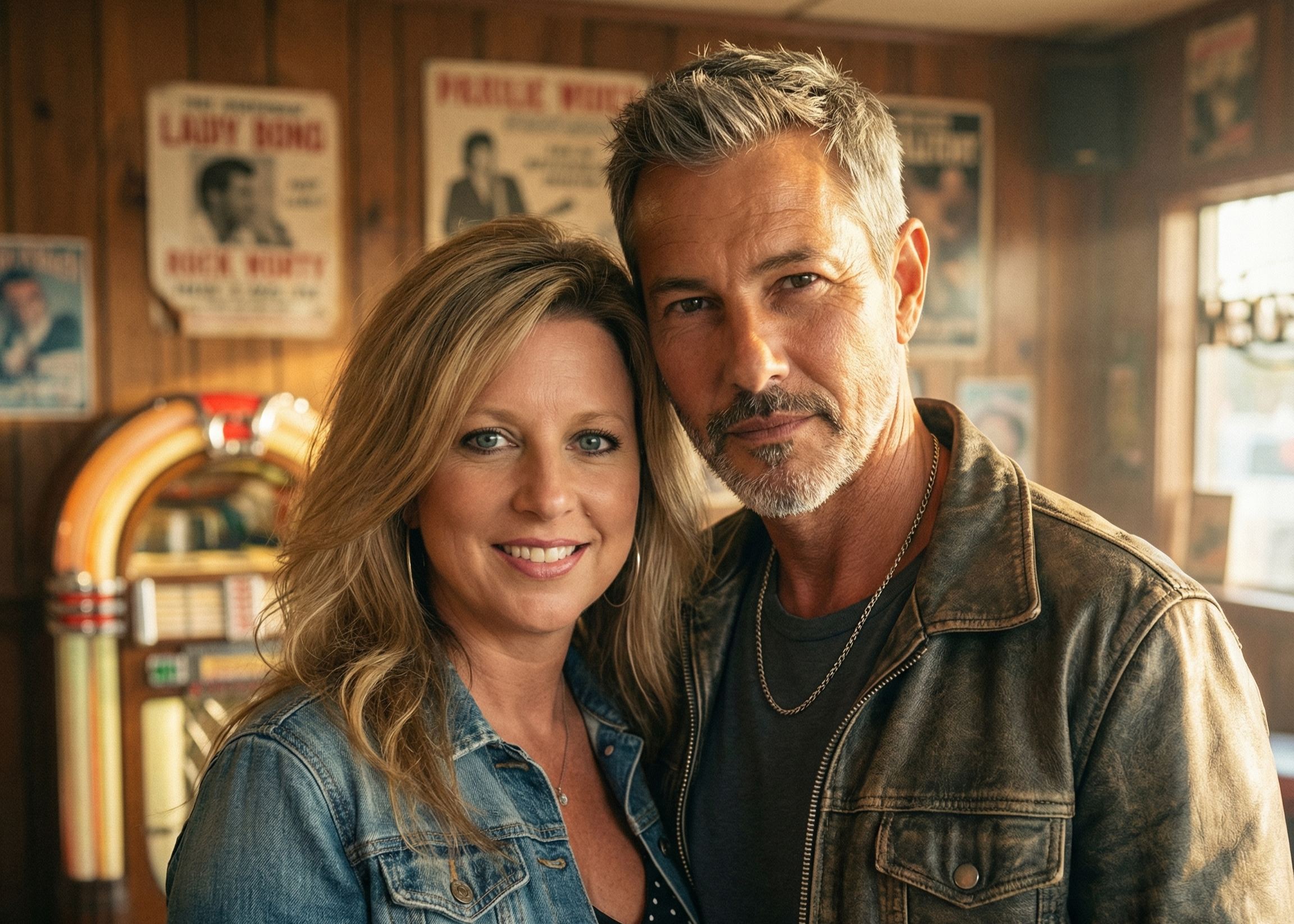 I really love the retro vibe of this cool place we found! The old wood walls and all the vintage music posters made it feel like we stepped back in time. There was even a classic jukebox in the corner playing old songs. I wore my favorite denim jacket over a polka-dot shirt, which I think fit the scene perfectly. The warm light coming through the window made everything feel so cozy while we hung out. It was a great afternoon just relaxing and enjoying the music. I am so happy we got these photos to remember such a fun and simple day.